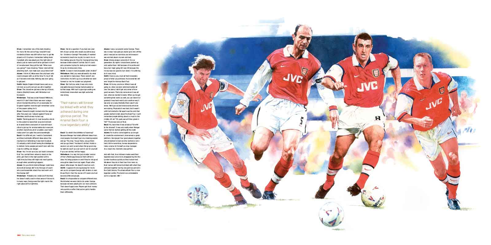 The cast of Arsenal legends featured includes Arsène Wenger, Charlie George, Dennis Bergkamp, Patrick Vieira, Frank McLintock, Freddie Ljungberg, Tony Adams, Ian Wright, Steve Bould, David O’Leary, Pat Jennings, David Seaman, Ray Parlour, Bob Wilson, George Graham, Cesc Fabregas, Lee Dixon, Nigel Winterburn and many more.