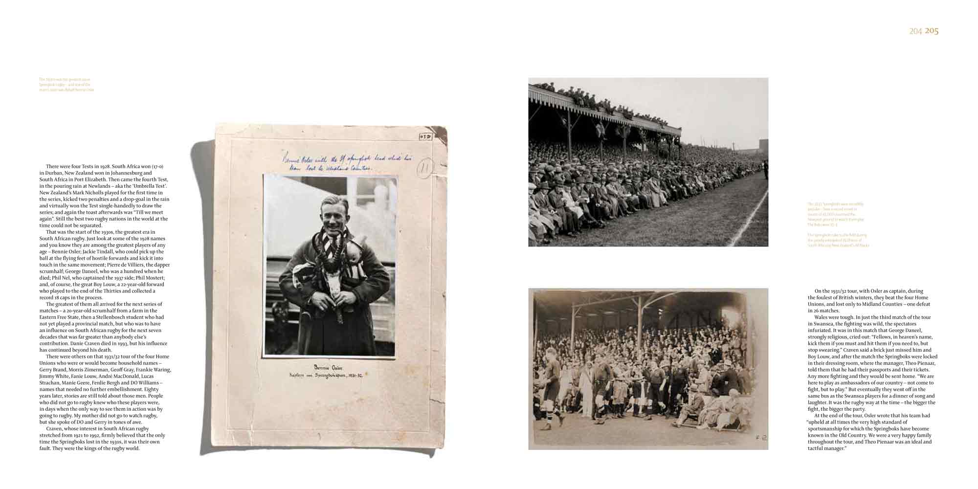 The Official Springbok Opus takes the reader on an emotional journey both on and off the field of play. The story of the development of the iconic jersey, the first tours, the challenges of wartime and social unrest, the battles with great rivals from Australia, New Zealand and the British Isles, the unique influence of Danie Craven, the unification of a nation, the move into the professional era, the glory of the World Cups and, of course, the incredible players that have worn the famous Green and Gold shirt; every detail of this iconic story told through inspirational words and stunning imagery.