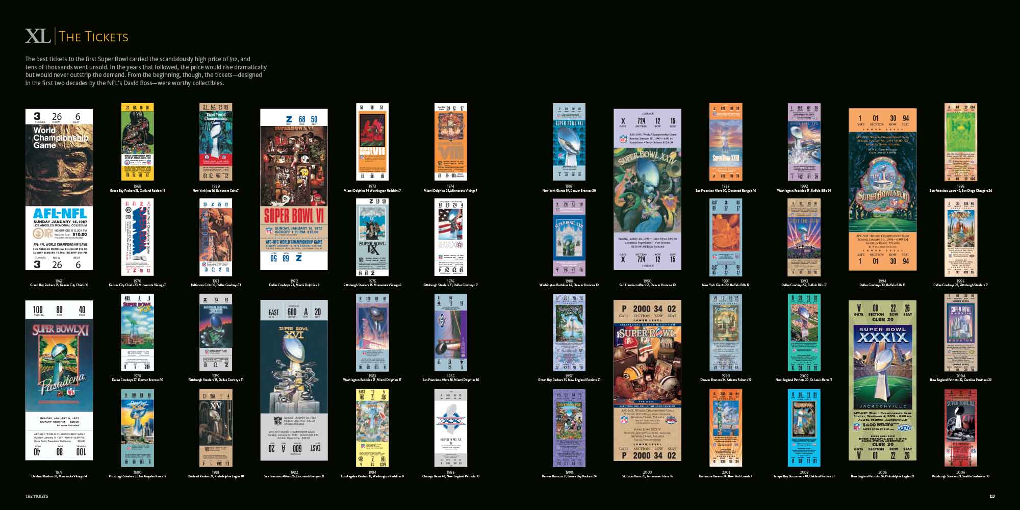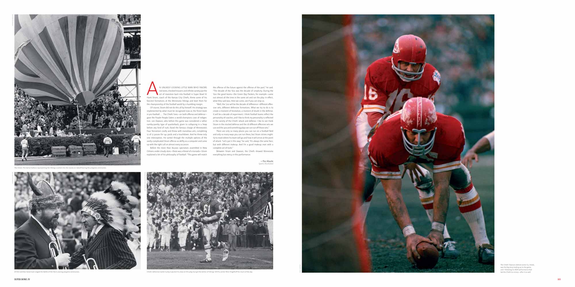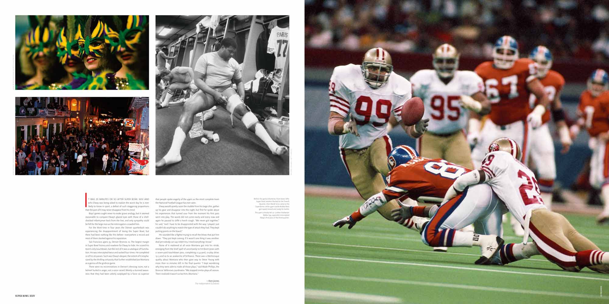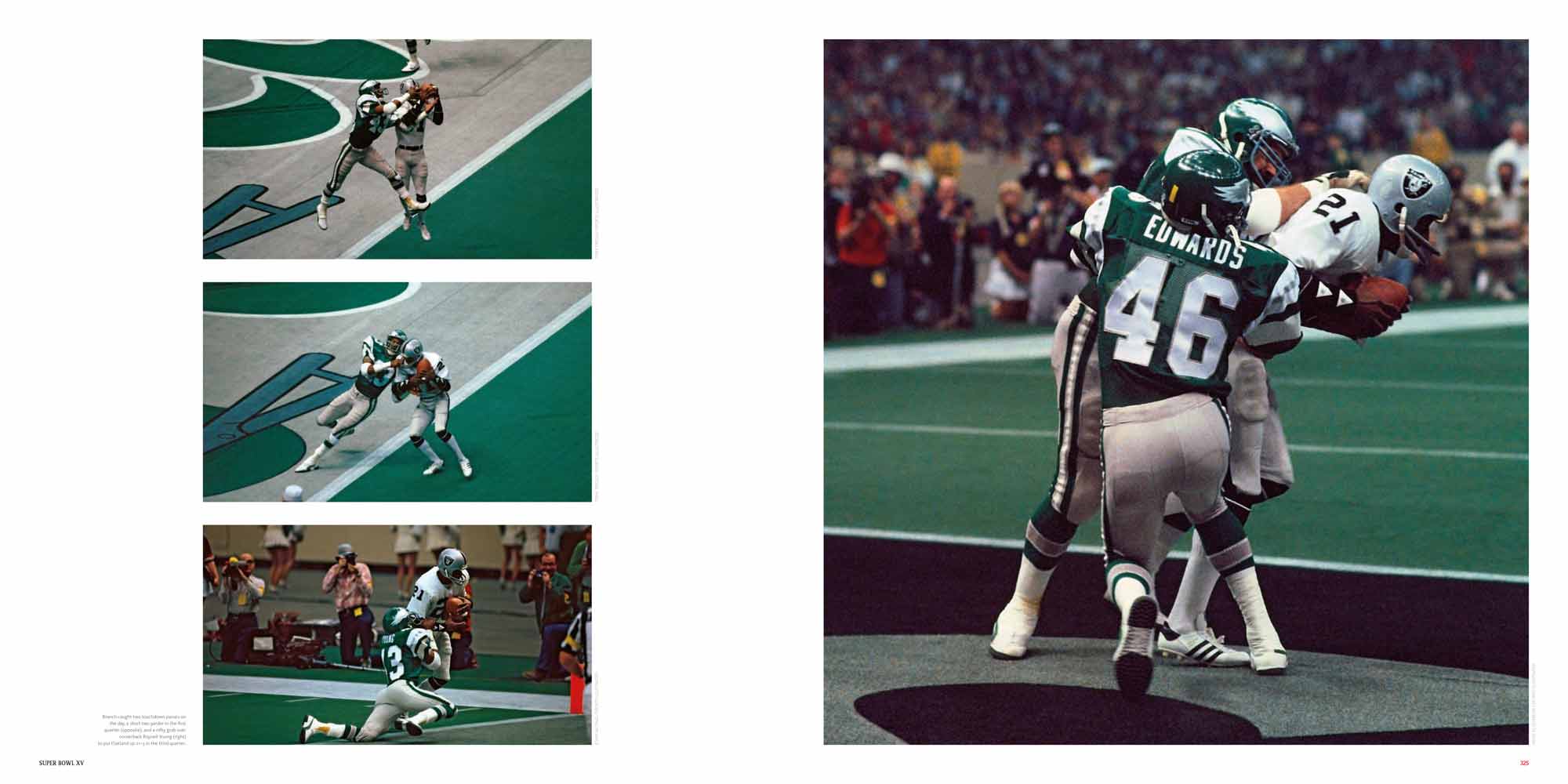 Chapters are dedicated to each Super Bowl, I to XL. These include a story of the season, a location shot of the stadium, the story of the game with stunning photography, a spread dedicated to the game’s MVP and a play-by-play game chart showing graphically every play of the game.