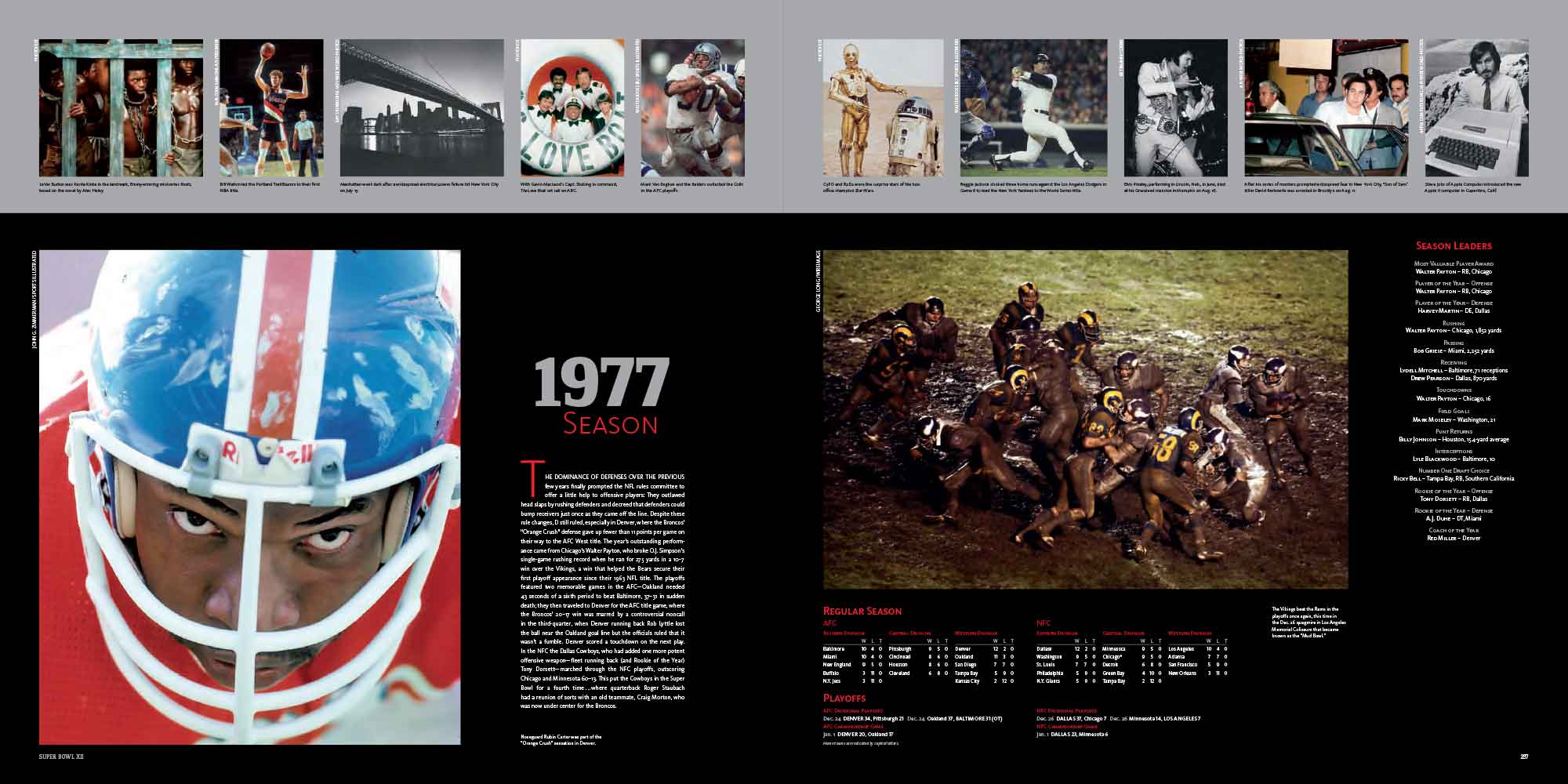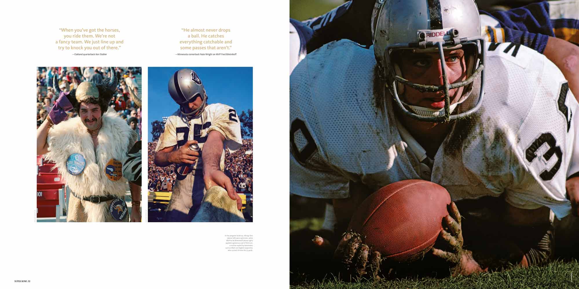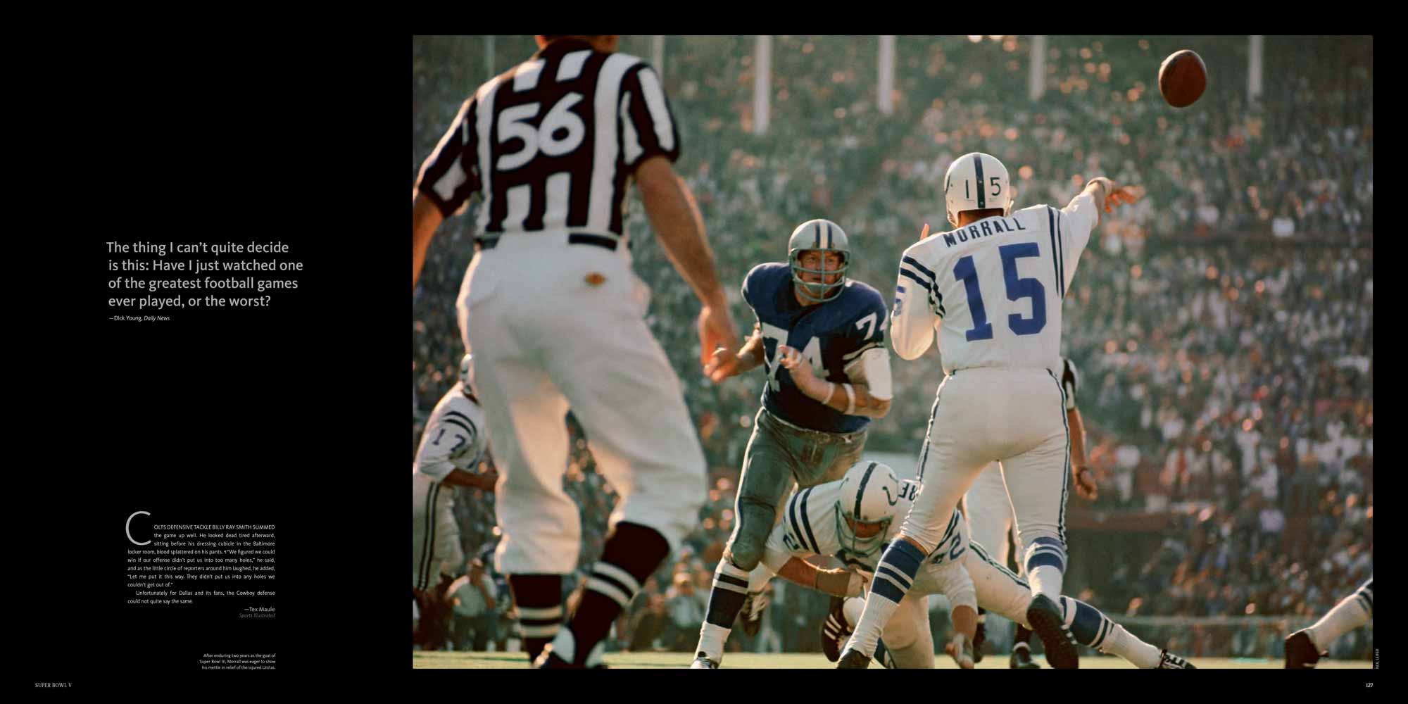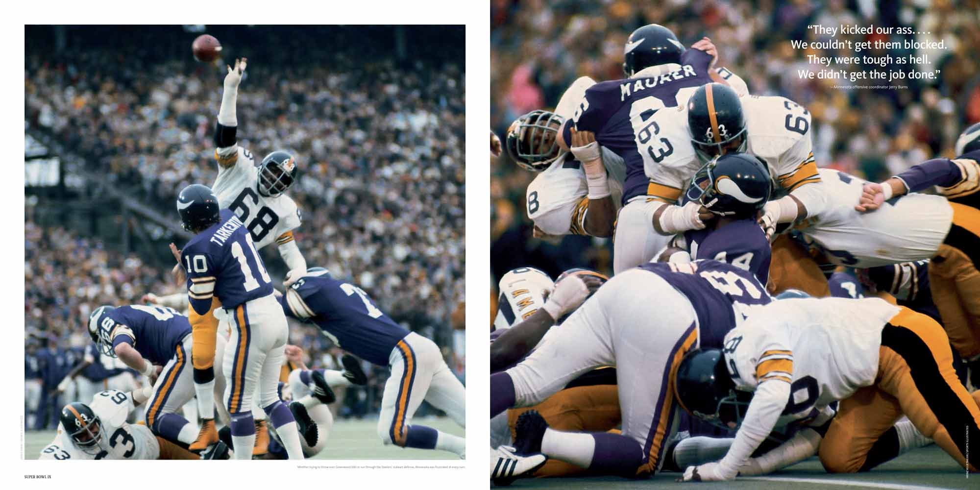 Chapters are dedicated to each Super Bowl, I to XL. These include a story of the season, a location shot of the stadium, the story of the game with stunning photography, a spread dedicated to the game’s MVP and a play-by-play game chart showing graphically every play of the game.
