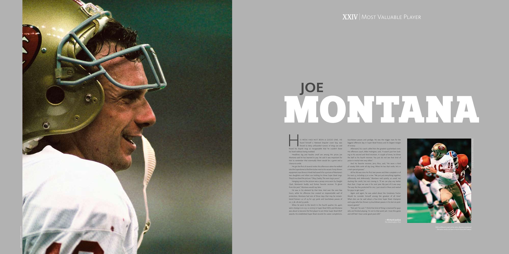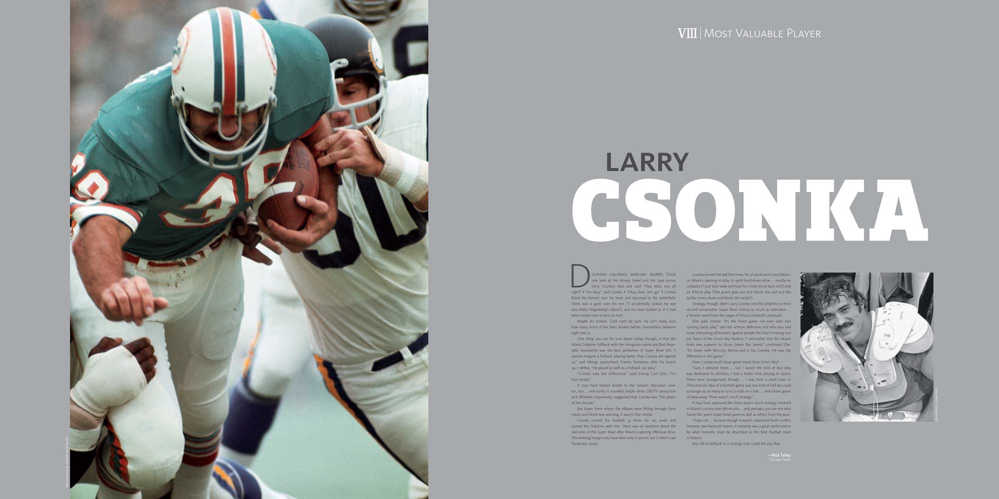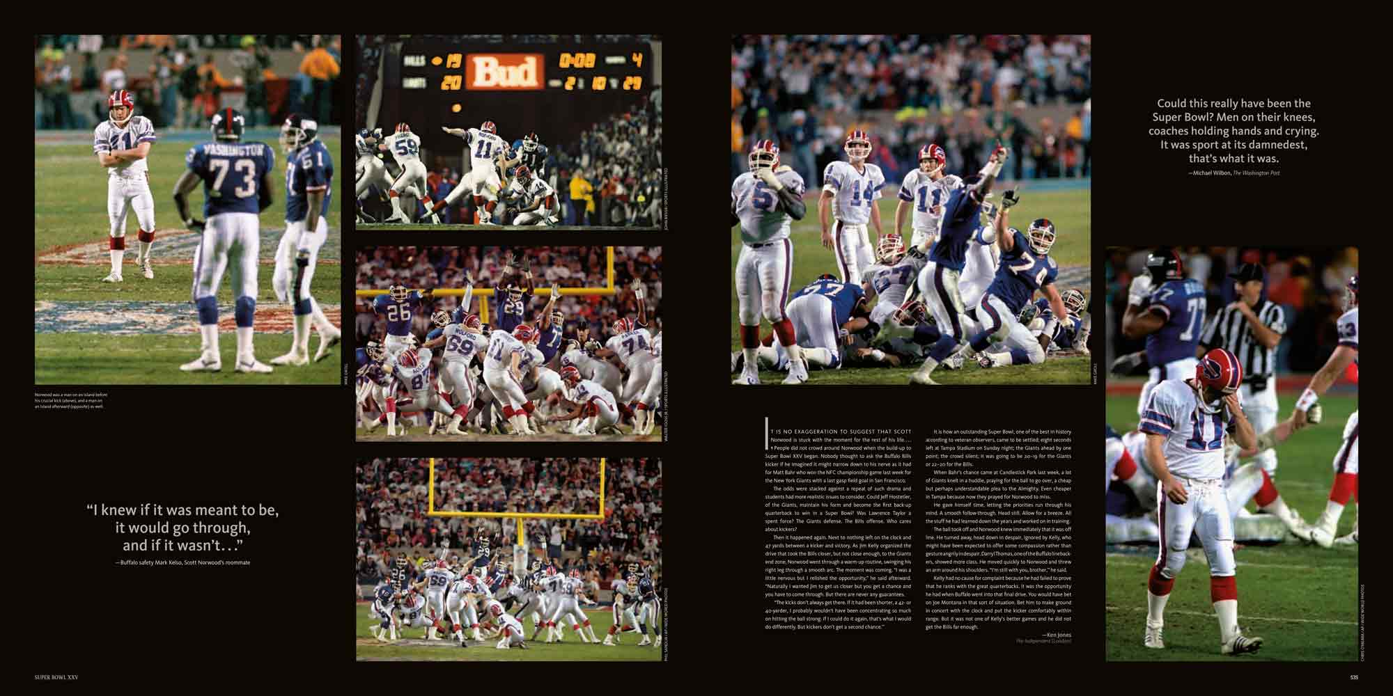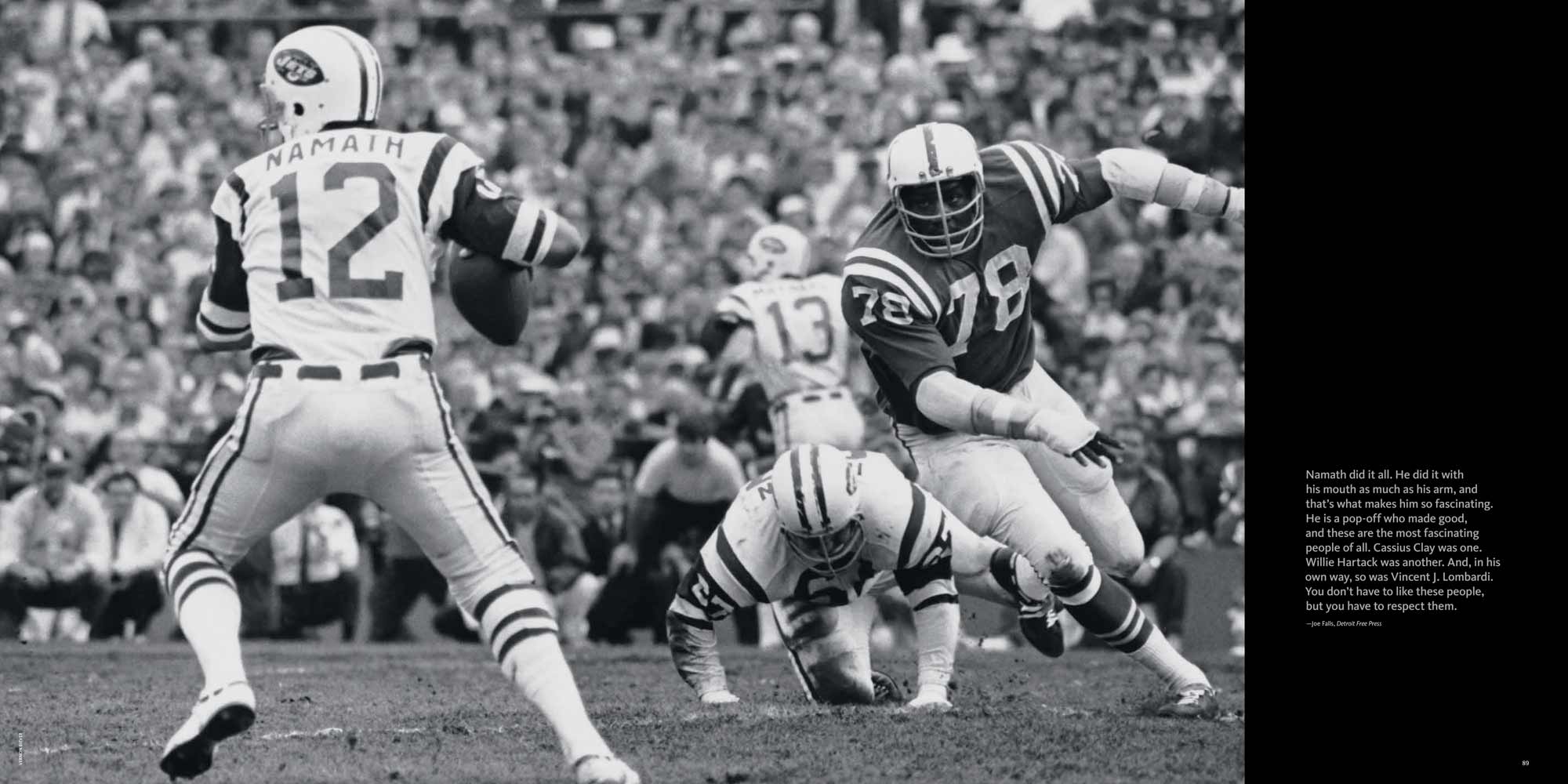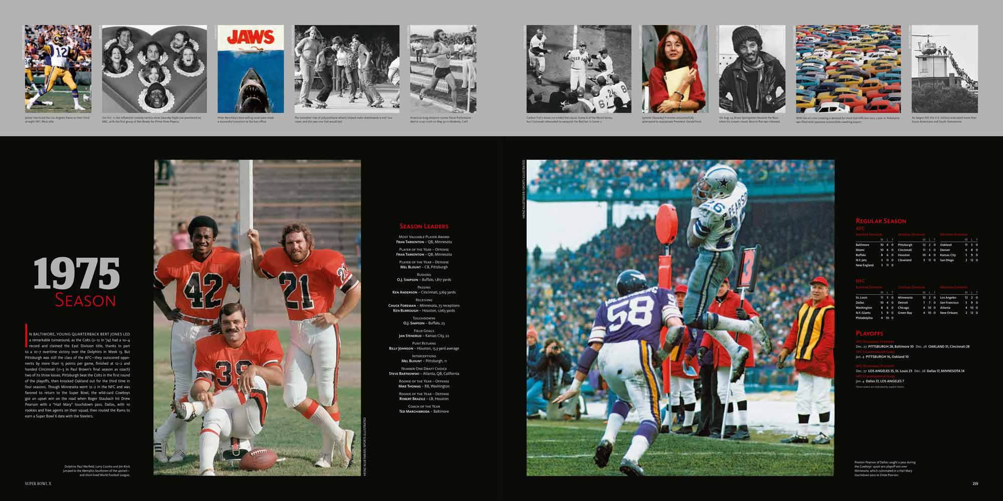 Chapters are dedicated to each Super Bowl, I to XL. These include a story of the season, a location shot of the stadium, the story of the game with stunning photography, a spread dedicated to the game’s MVP and a play-by-play game chart showing graphically every play of the game.