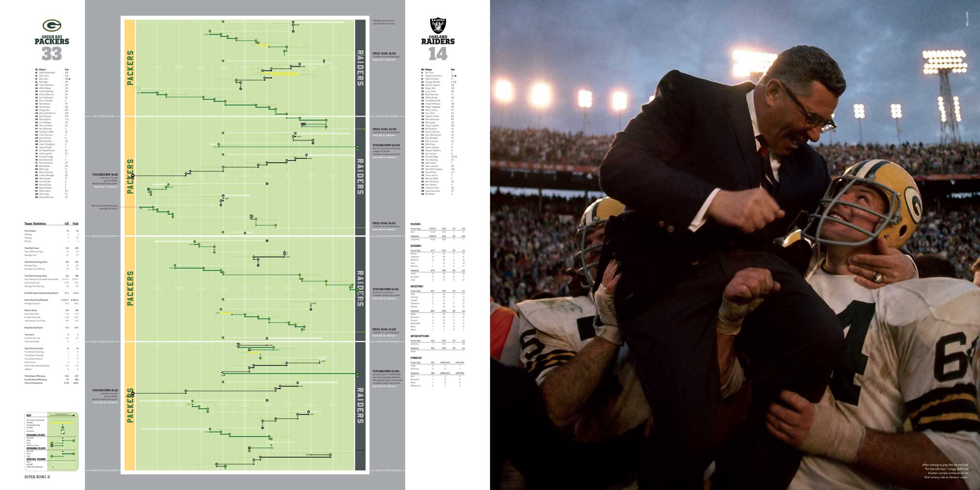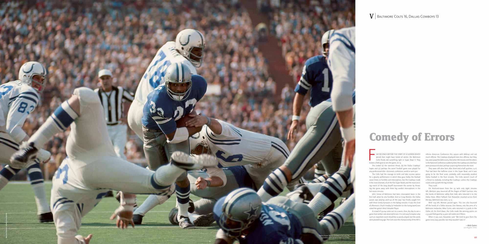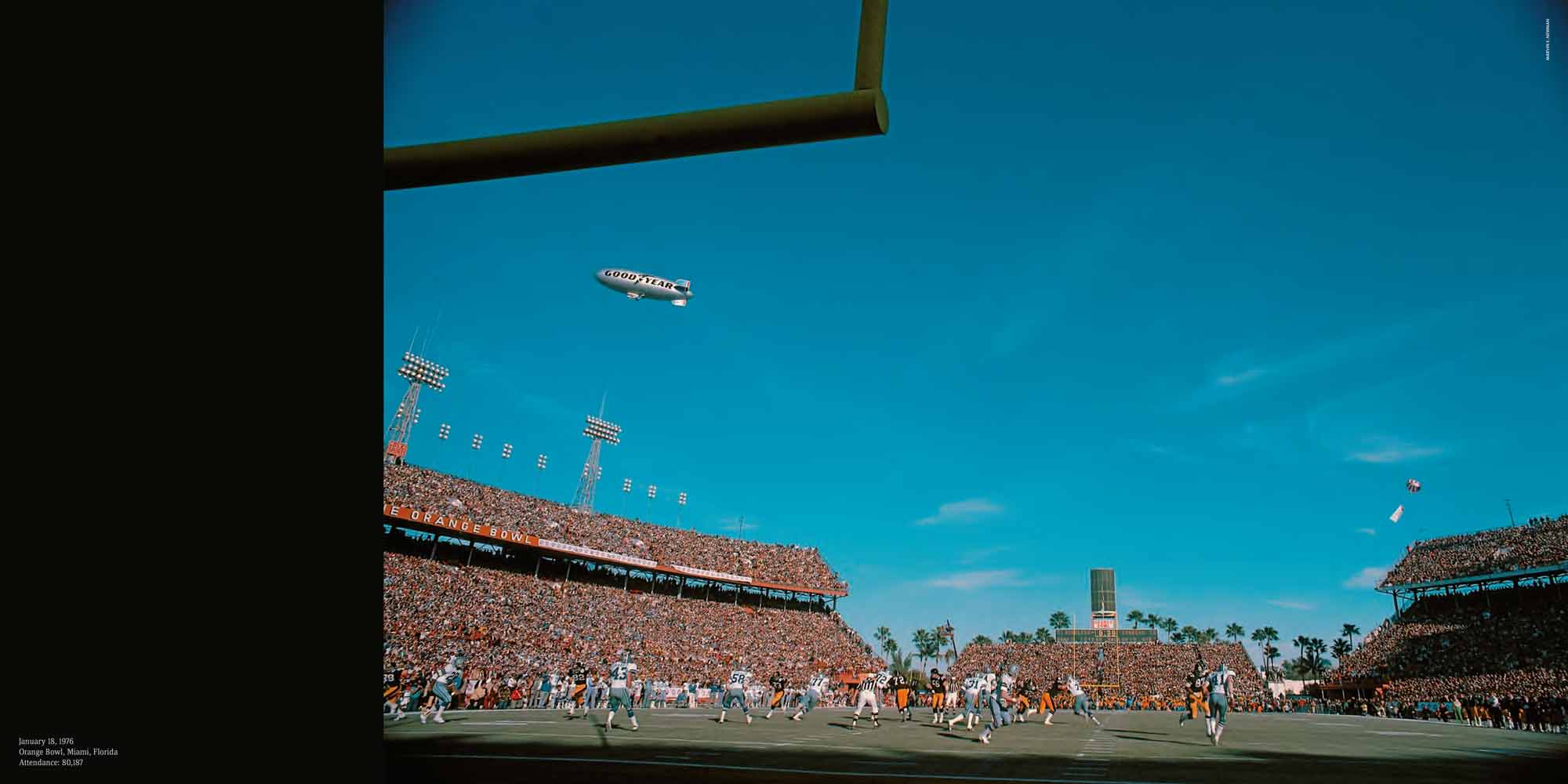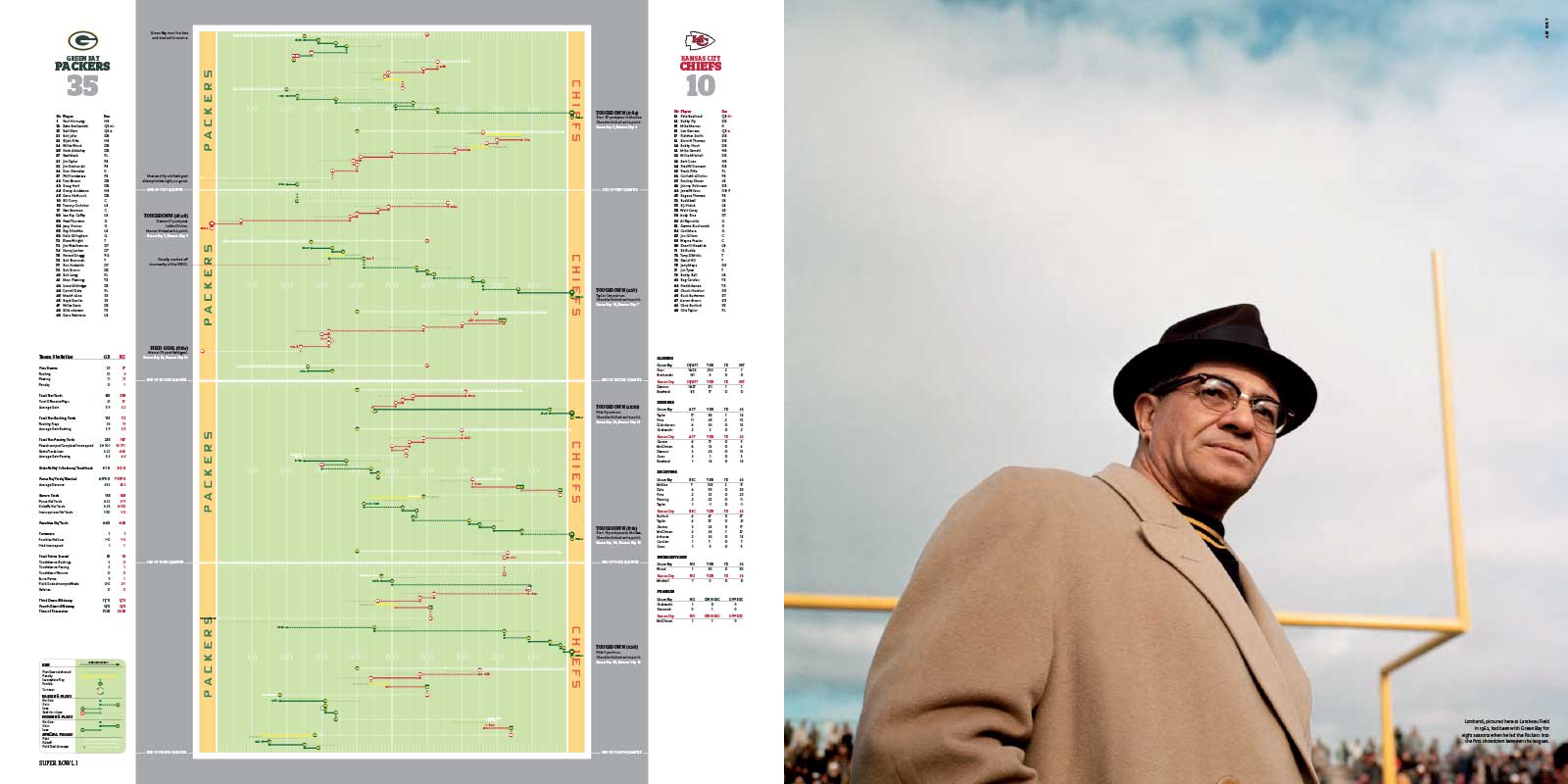 Chapters are dedicated to each Super Bowl, I to XL. These include a story of the season, a location shot of the stadium, the story of the game with stunning photography, a spread dedicated to the game’s MVP and a play-by-play game chart showing graphically every play of the game.